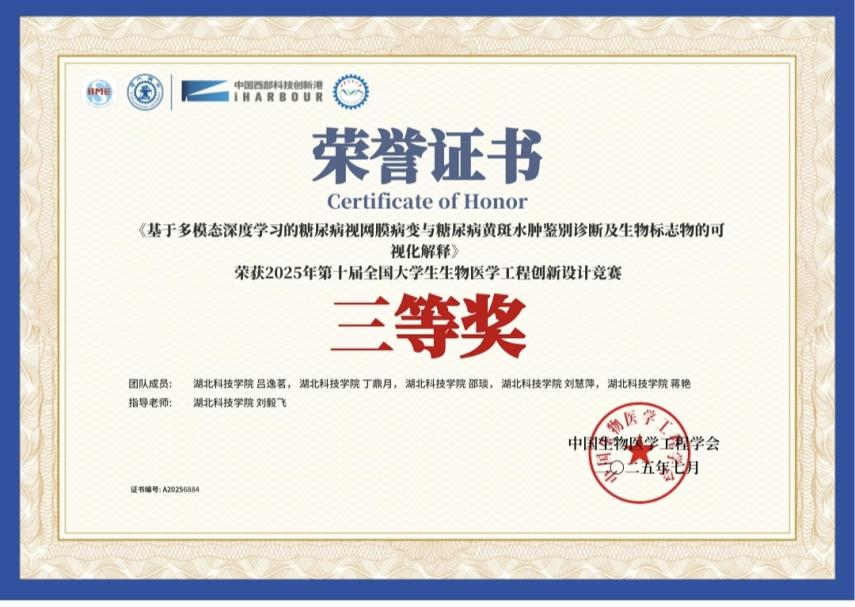 同时,在第十届全国大学生生物医学工程创新设计竞赛中,刘毅飞老师指导、23眼视光医学专业吕逸茗同学参与的两个项目分获二等奖和三等奖,体现了学院在医工交叉领域的教学与科研实力。