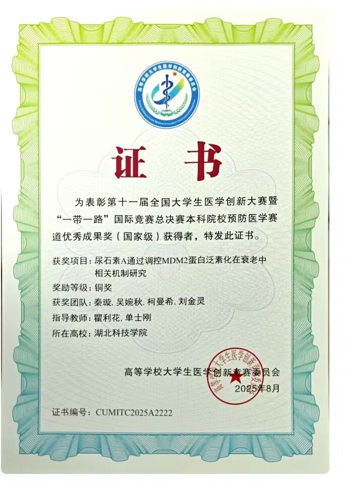 在第十一届全国大学生医学创新大赛暨“一带一路”国际竞赛中,学院师生表现尤为亮眼。由周慧芬、晏彪老师指导,2023级眼视光医学郭行健同学负责的项目《基于CRISPR-cas12a系统的KRAS基因精准诊疗体系构建研究》荣获国家金奖(最佳团队合作奖)及省级一等奖;由许波老师指导,2022级口腔医学王琳同学负责的项目《结合AI和合成生物学开发治疗高尿酸血症的功能性益生菌》项目荣获国家级银奖及省级一等奖;由黄彬、陈黄琴老师指导的项目《锰基纳米酶化学动力治疗口腔鳞状细胞癌的机制:线粒体自噬》获省赛二等奖;由刘毅飞、周燕红老师指导,2023级眼视光医学专业张乐天负责的项目《补骨脂乙素靶向PARP1抑制细胞焦亡缓解溃疡性结肠炎的机制研究》获复赛三等奖;由包永芬、单士刚老师指导,2023级临床医学(眼耳鼻喉方向)王彬羽负责的项目《黄芩素调控类风湿性关节炎和炎症相关机制研究》获省赛三等奖,此外,多个项目在省级赛中获优秀奖,涵盖口腔医学、眼视光医学、基础临床、交叉学科等多个赛道。